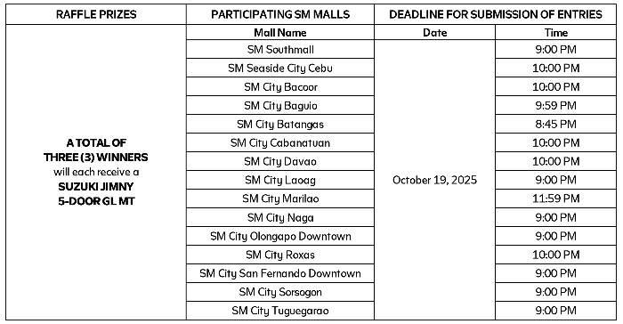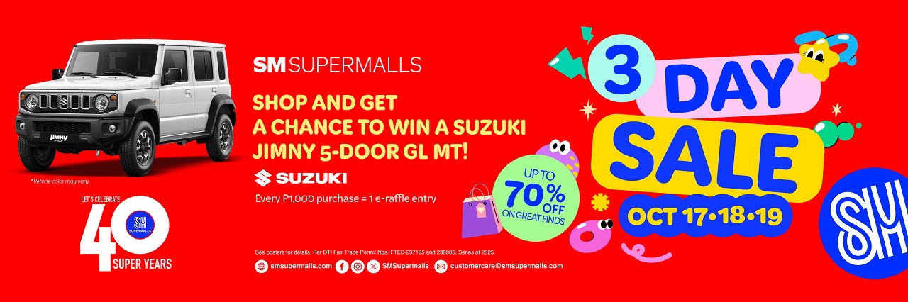 Shoppers can participate in the raffle by making a purchase of P1,000 or more at any participating SM Supermalls branch during the sale period. They can also get additional entries by shopping on Saturday and Sunday, or by creating an SM Malls Online Account. Check list of participating malls near you: Southmall, Seaside City Cebu, Bacoor, Baguio, Batangas, Cabanatuan, Davao, Laoag, Marilao, Naga, Olongapo Downtown, Roxas, San Fernando Downtown, Sorsogon, Tuguegarao.