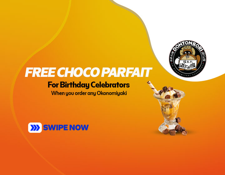 Simply order any Okonomiyaki and get a free choco parfait when you visit Dohtonbori within your birth month!