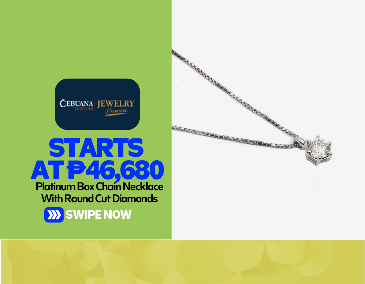 Indulge in the radiance of this Platinum Box Chain Necklace with Round Cut Diamonds from Cebuana Lhuillier Jewelry Premium. Starting at P49,680, the 16-inch pieceweighing 3.2 grams is crafted with 85% pure platinum with a PT850 marking, a spring roll lock, and brilliant round cut diamonds. ICYDK—Jewelry pieces made from platinum offer exceptional durability, hypoallergenic properties, and timeless, naturally white luster that doesn't require replating.