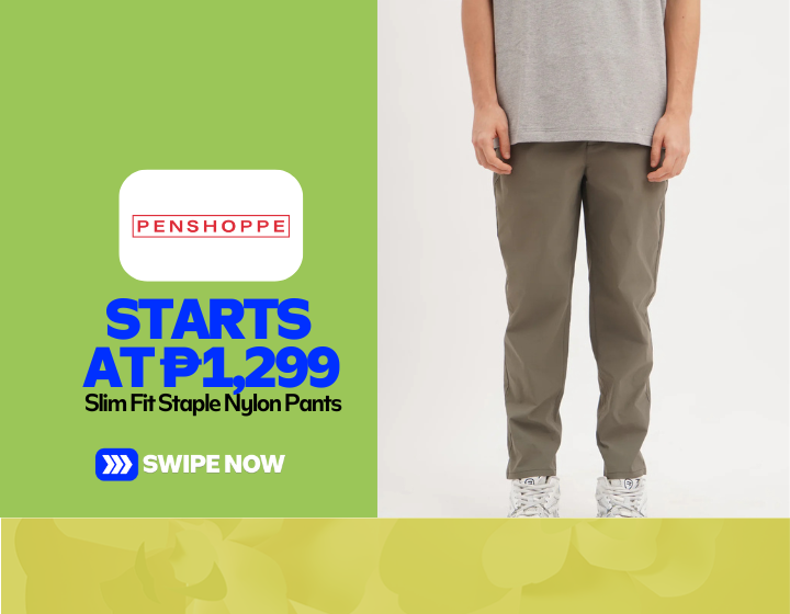 A modern twist on a classic silhouette. Cop Penshoppe's Slim Fit Staple Nylon Pants starting at P1,299. Available in olive, this pair features a adjustable inside draw cords and a welt pocket in a plain weave fabric made with 95% nylon and 5% spandex, giving it some stretch and shape. It's also lightweight, water-repellant, and quick-drying.
