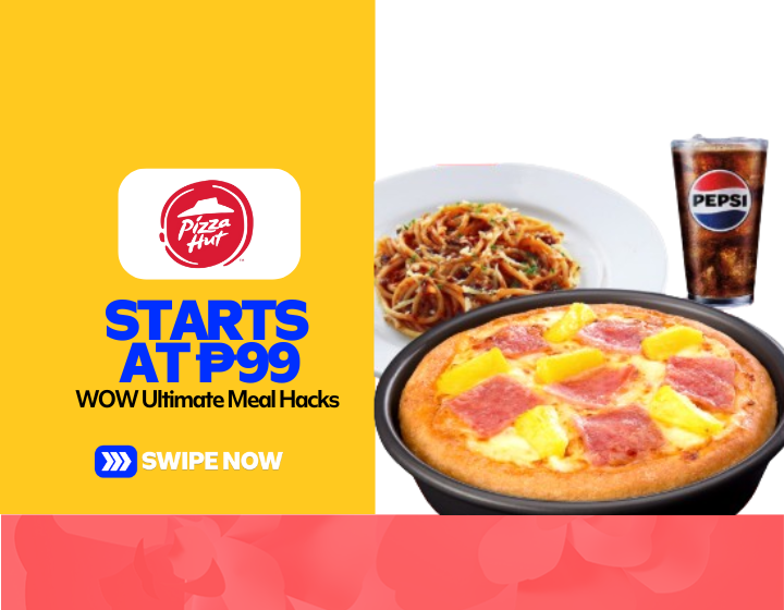 A complete meal starting at P99? Yup, you read that right! Big cravings don't need big spending at Pizza Hut, with their WOW Ultimate Meal Hacks. Start with Meal A, which includes your favorite solo pan pizza and a plate of spaghetti, served with an ice-cold Pepsi. Valid for dine-in transactions only.