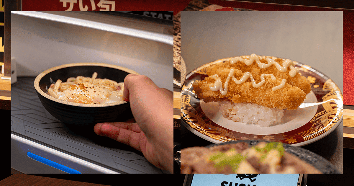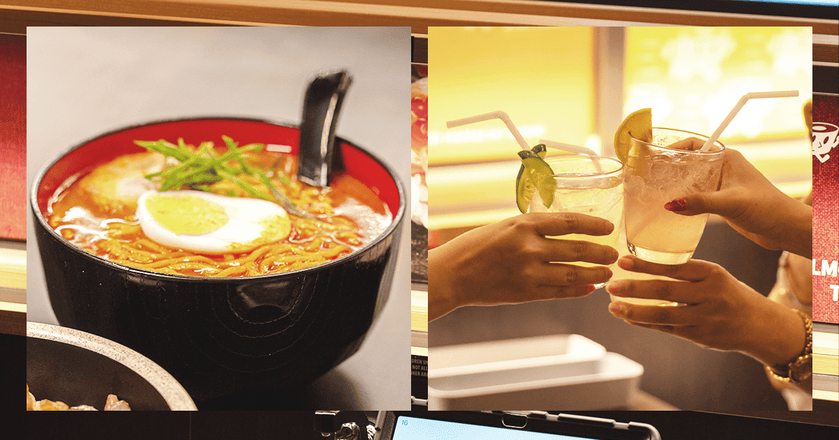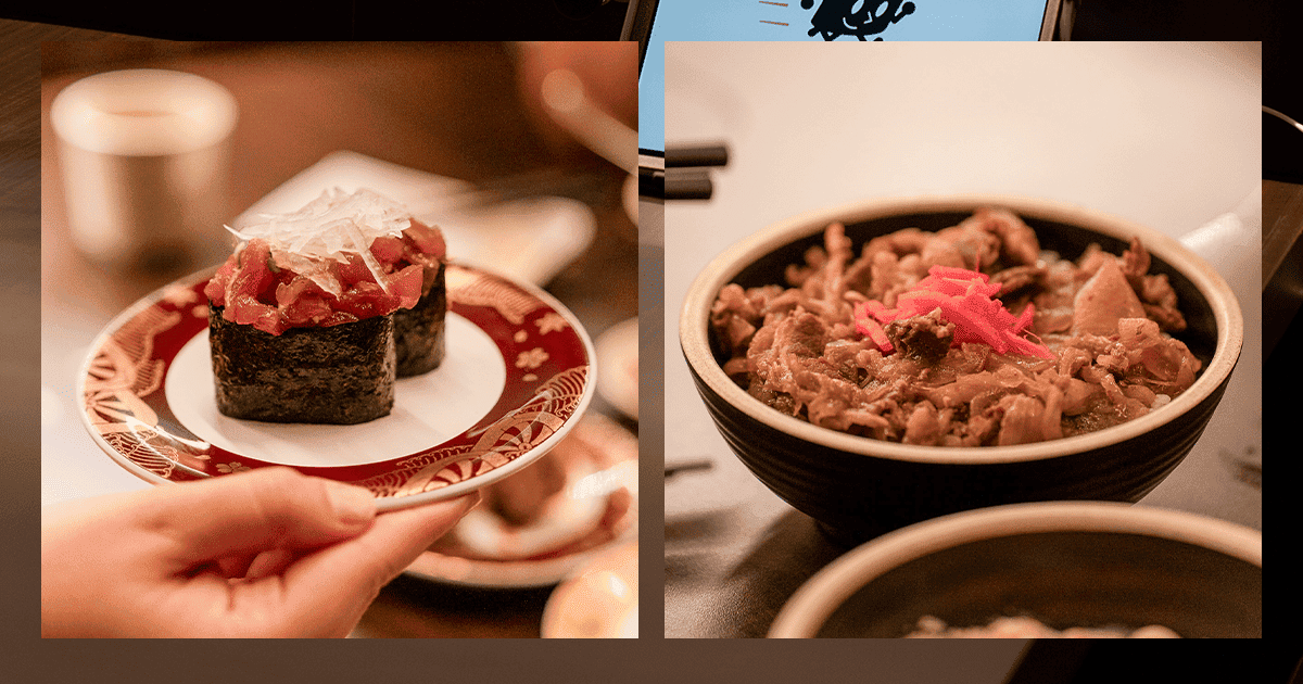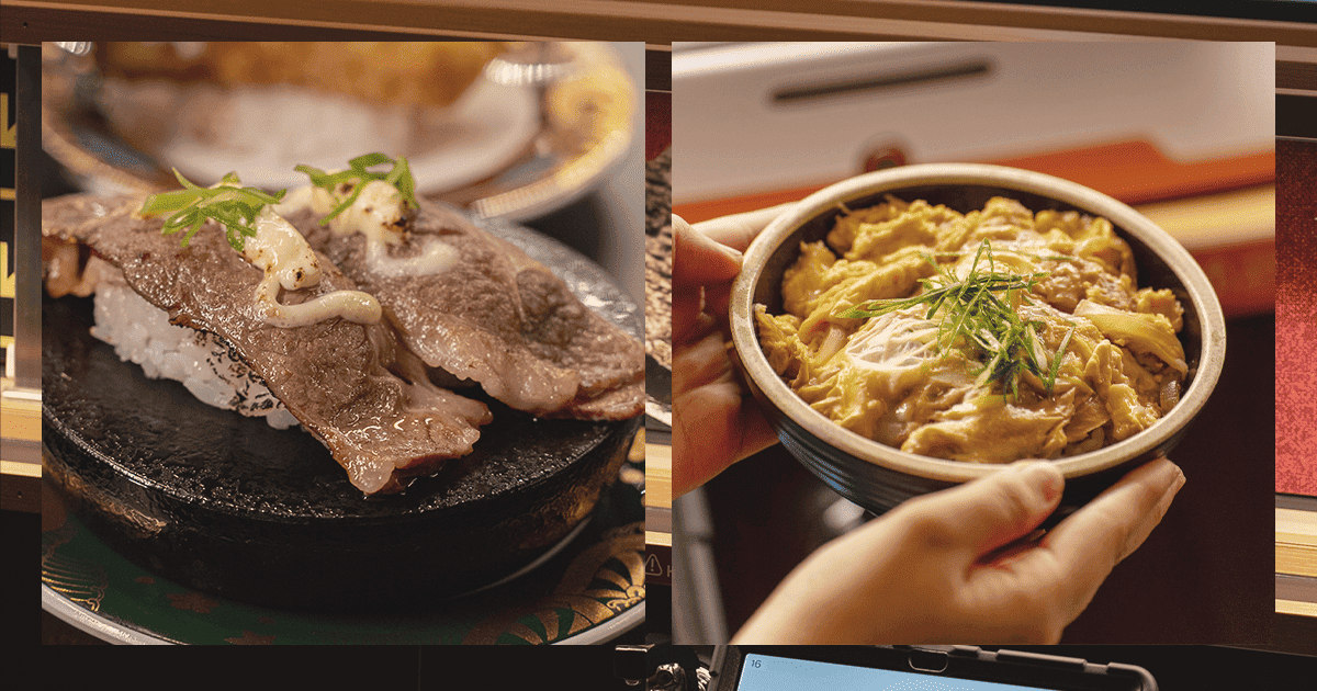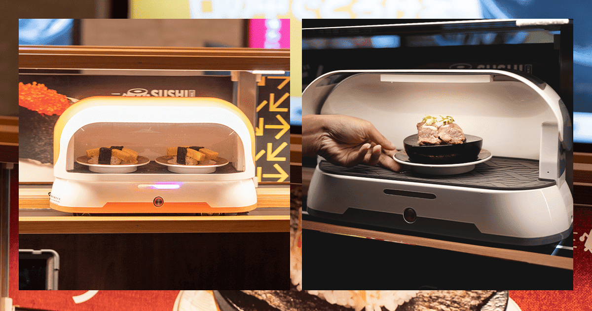 Orders placed through the table-side tablet arrive swiftly via charming miniature trains gliding along a conveyor belt.