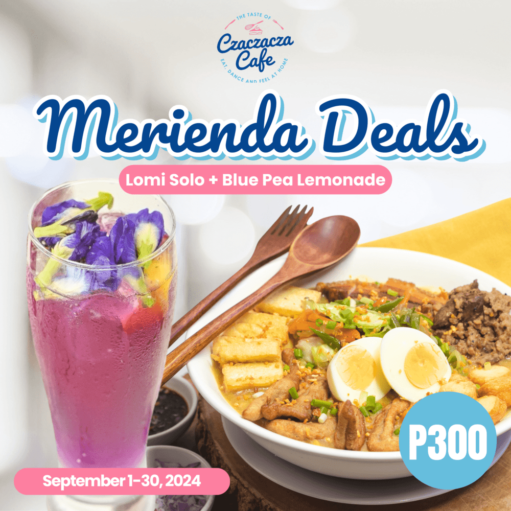 Dive into a hearty Merienda Deal at Taste of Czaczacza! For just P300, indulge in a savory Lomi Solo paired with a refreshing Blue Pea Lemonade drink!