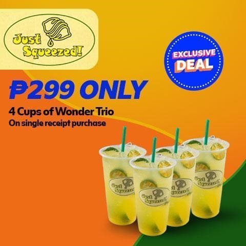 Barkada bondings get better with a delicious thirst quencher in hand! For just P299, you can get 4 cups of the refreshing Wonder Trio at Just Squeezed—perfect for sharing with your friends!