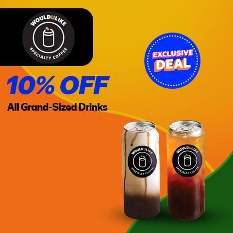 Drink coffee the Korean way! Get 10% off on all Grand-sized Drinks at WouldULike, the innovative South Korean coffee chain that makes each drink fresh and sealed in cans to preserve its delicious taste and temperature!