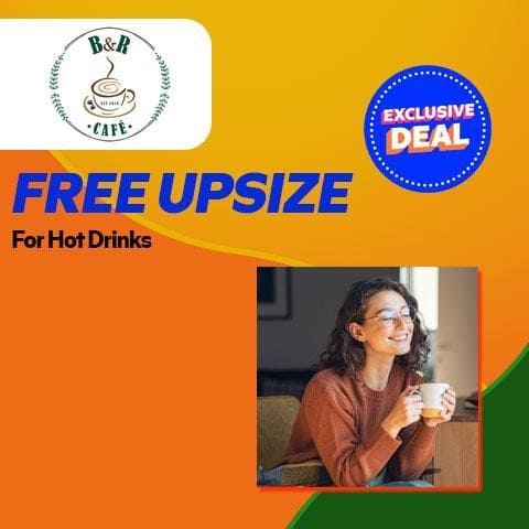 Your perfect cup just got bigger! Buy any hot drink from B&R Cafe and enjoy a free upsize from 8oz to 12oz!