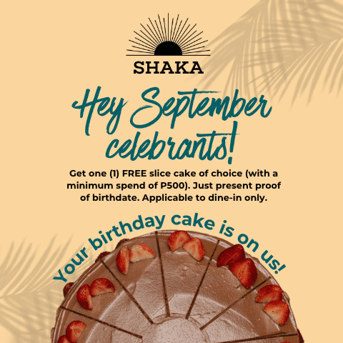 Celebrate your birthday by dining in at Shaka Cafe and get a FREE slice of cake of your choice! Just present proof of your birthdate and spend a minimum of P500! September celebrants, now is your time! Everyone else, don’t fret—this offer is valid until December 31, 2024!