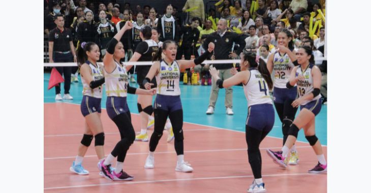 National University (NU) Lady Bulldogs volleyball players celebrate a point against the University of Santo Tomas (UST) Golden Tigresses during the University Athletic Association of the Philippines (UAAP) Season 86 Women’s Volleyball Tournament last year at the SM Mall of Asia (MOA) Arena.