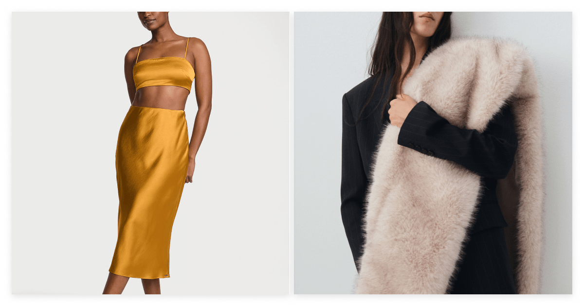 Satin crop bandeau top and slip skirt set in golden chai from Victoria’s Secret, finished with a fur-effect scarf from Mango (like Mimi who loves a dramatic shawl).