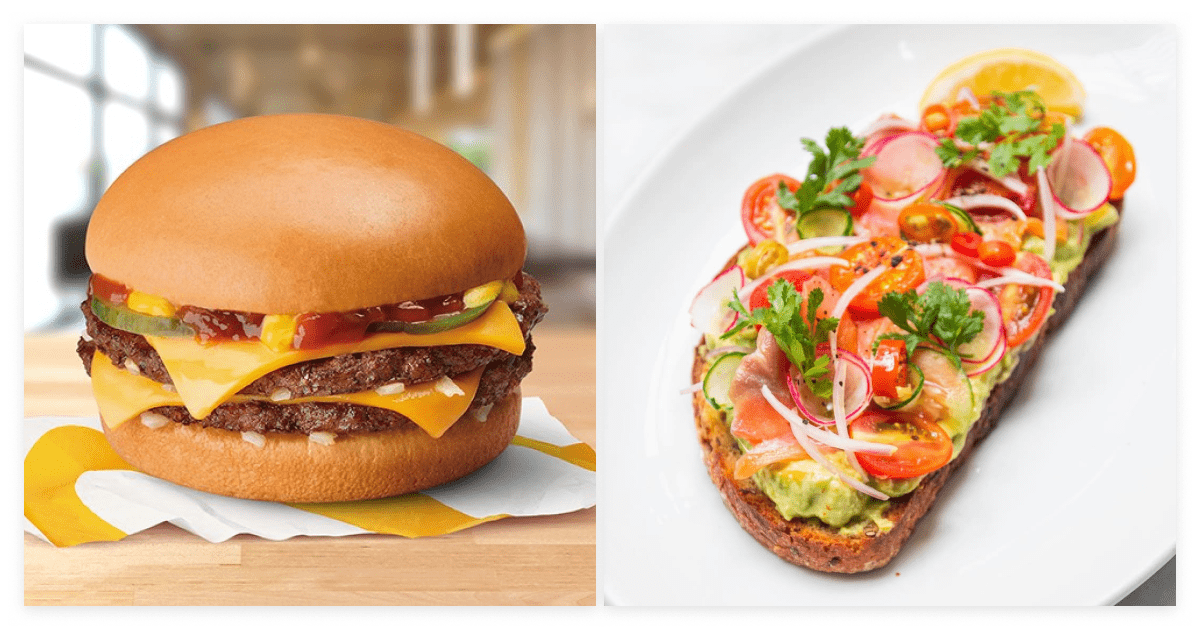 Photos of double cheeseburger (left) and salmon tartine (right) from the McDonald’s website and Wildflour’s Facebook page.