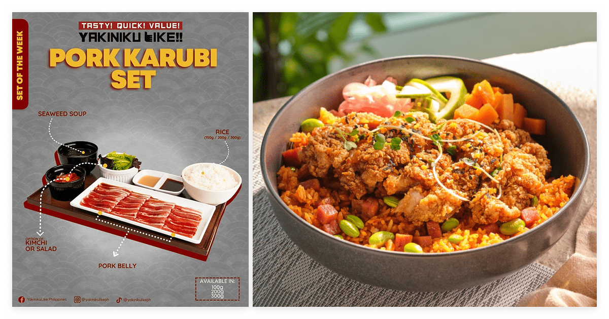 Photos of Pork Karubi Set (left) and Korean Chicken Chop (right) from Yakiniku Like and Brunch Bureau on Facebook