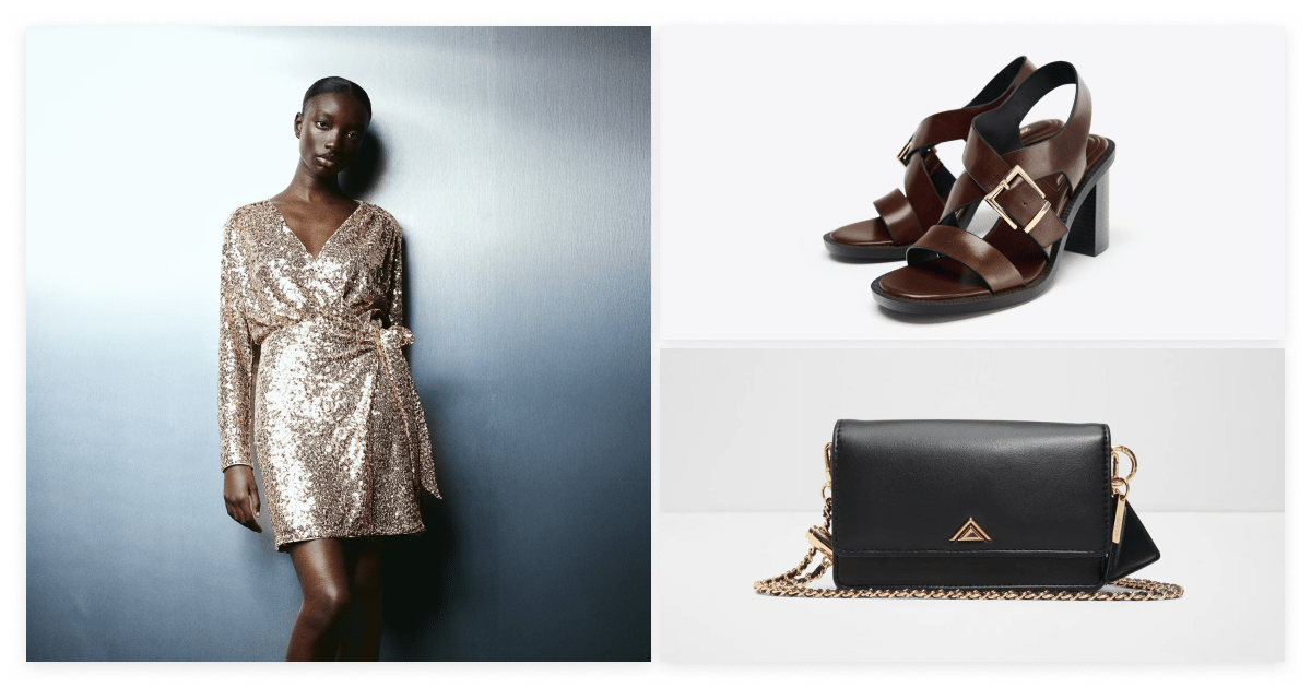 Sequined wrap dress from H&M, leather high-heel sandals with buckles from Zara, and the Fiteverything bag with chain from Aldo.