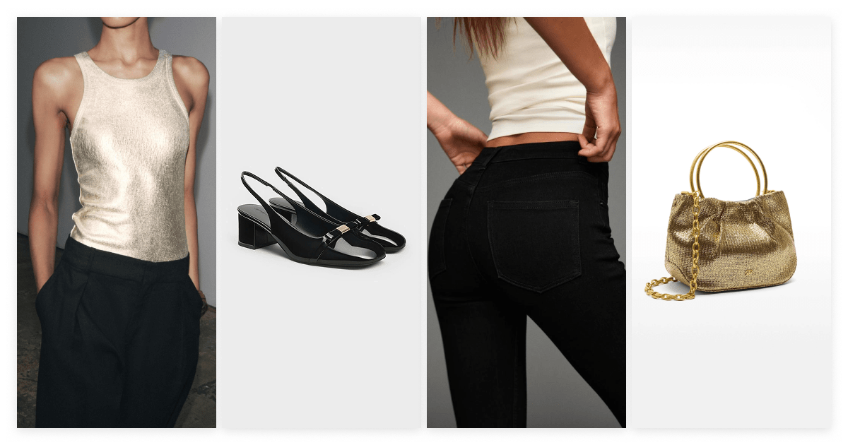 Metallic ribbed bodysuit from Zara, super high-waist soft skinny jeans from Bershka, Dorian patent bow block-heel slingback pumps from Charles & Keith, and metallic party clutch from Parfois.