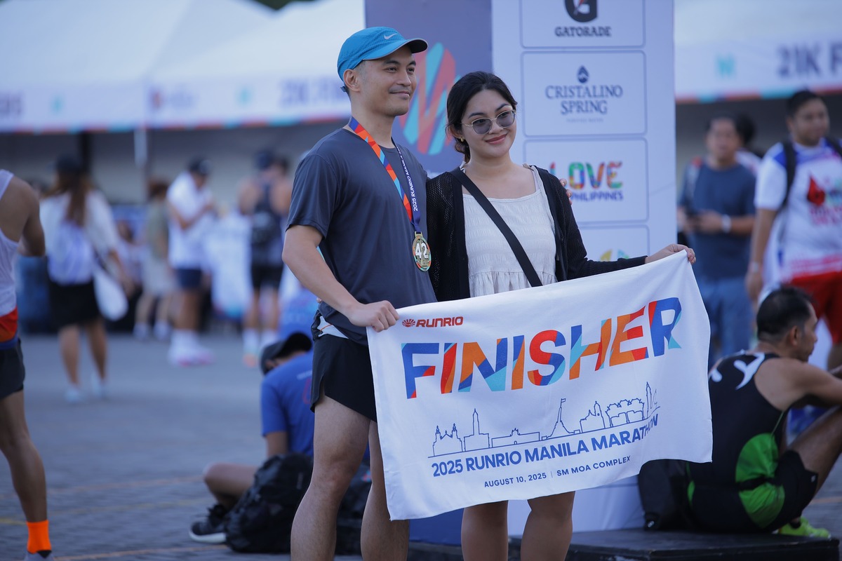 A proud 42K finisher poses with a supporter after completing the 2025 Runrio Manila Marathon at the SM Mall of Asia Complex on August 10, 2025.