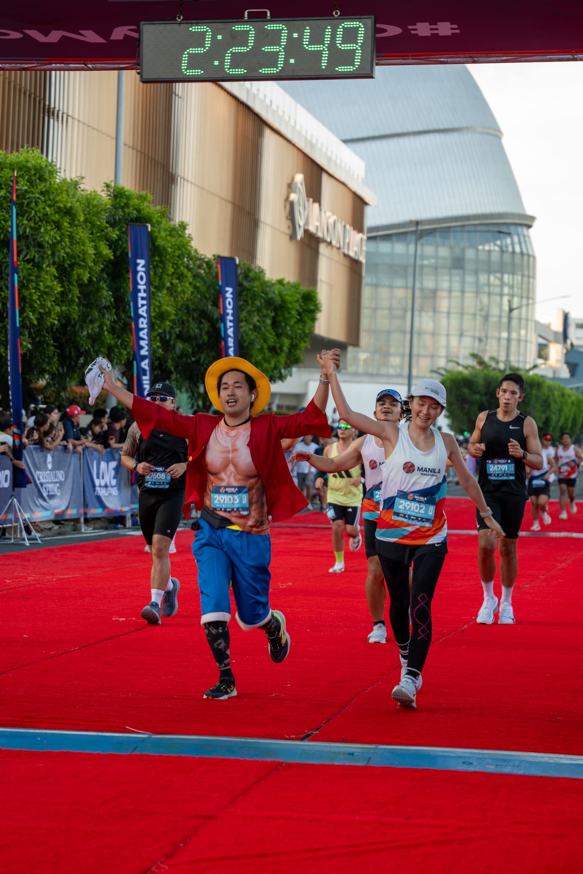 Runners cross the red-carpet finish line in high spirits at the 2025 Runrio Manila Marathon, held at the scenic SM Mall of Asia Complex.