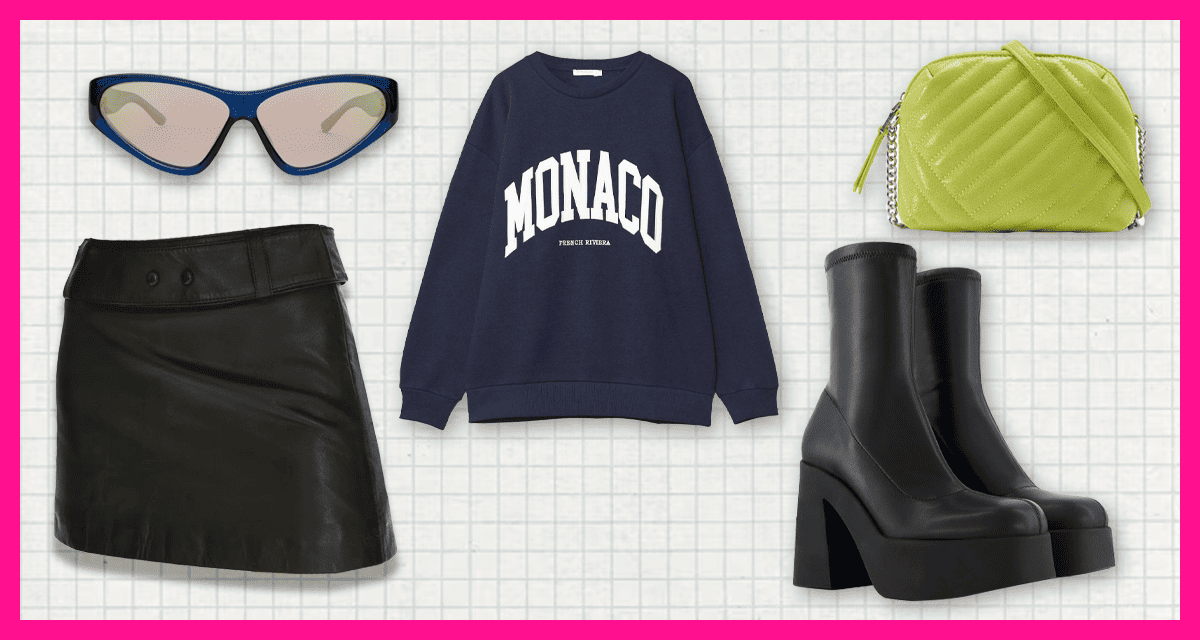 Clockwise: Zoe Sunnies from Sunnies Studios, Oversized Sweatshirt from Stradivarius, Green Quilted Crossbody Bag from Parfois, Fitted high-heel platform ankle boots from Bershka, and Belted leather mini-skirt from H&M
