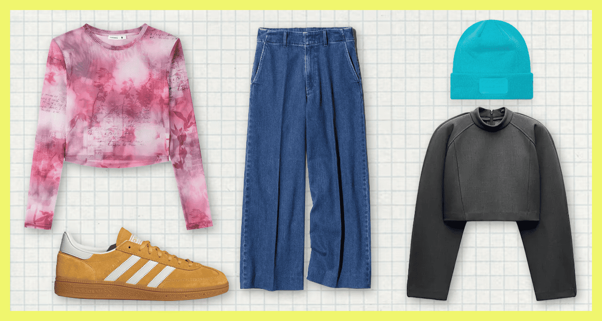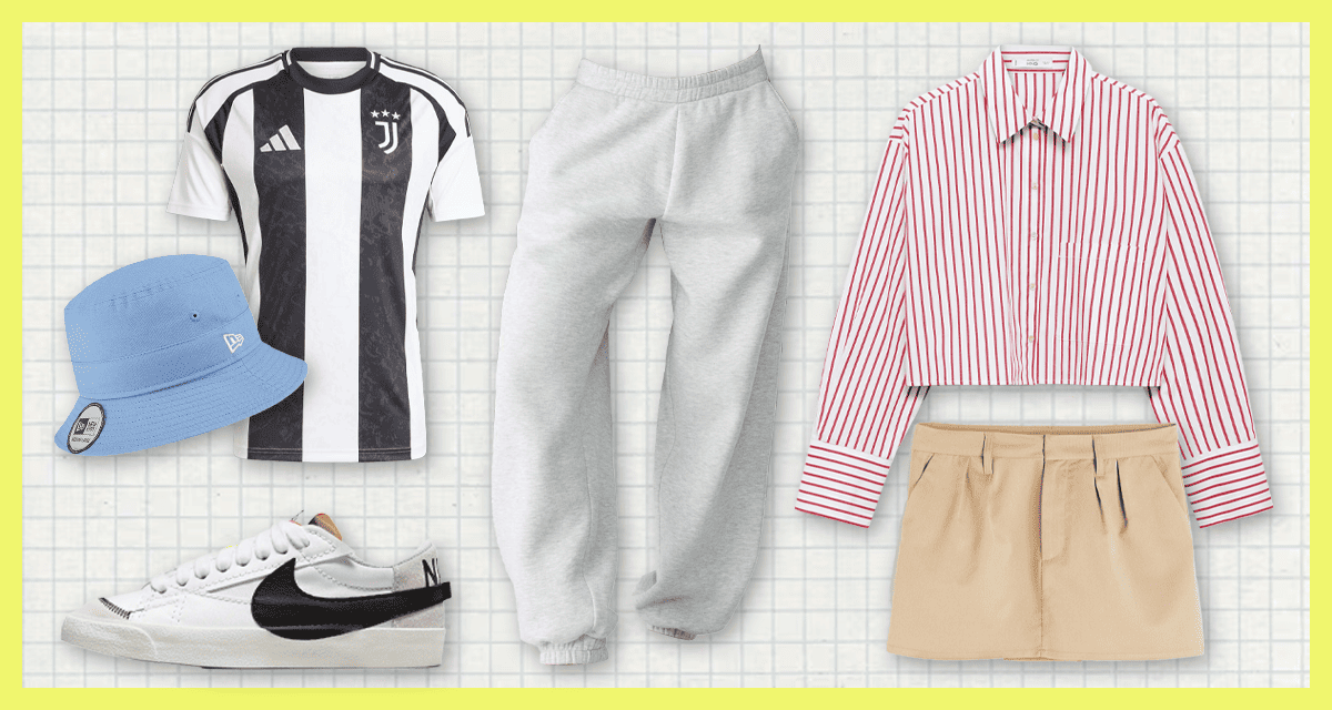Clockwise: Plain Caroline Blue Strap Bucket Hat from New Era, Juventus 24/25 Home Jersey from Adidas, Plush Boyfriend Joggers from Stradivarius, Striped cropped shirt from Mango, Mini Skirt from H&M, Blazer Low ‘77 Jumbo from Nike