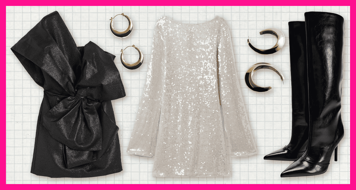 Left to Right: Bow-front MIni Dress from H&M, Volume Hoop Earrings from Mango, Sequin Open Back Mini Dress from Monki, Oval Hoop Earrings from Mango, and Wide leg heeled boots from Zara