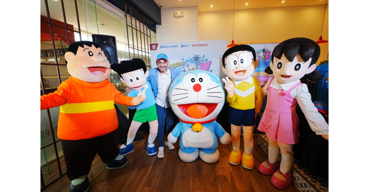 Doraemon and his friends strike a fun pose with Andrew Neri, General Manager of RUNRIO, celebrating the excitement and energy behind Doraemon Run 2026 at SM Mall of Asia.