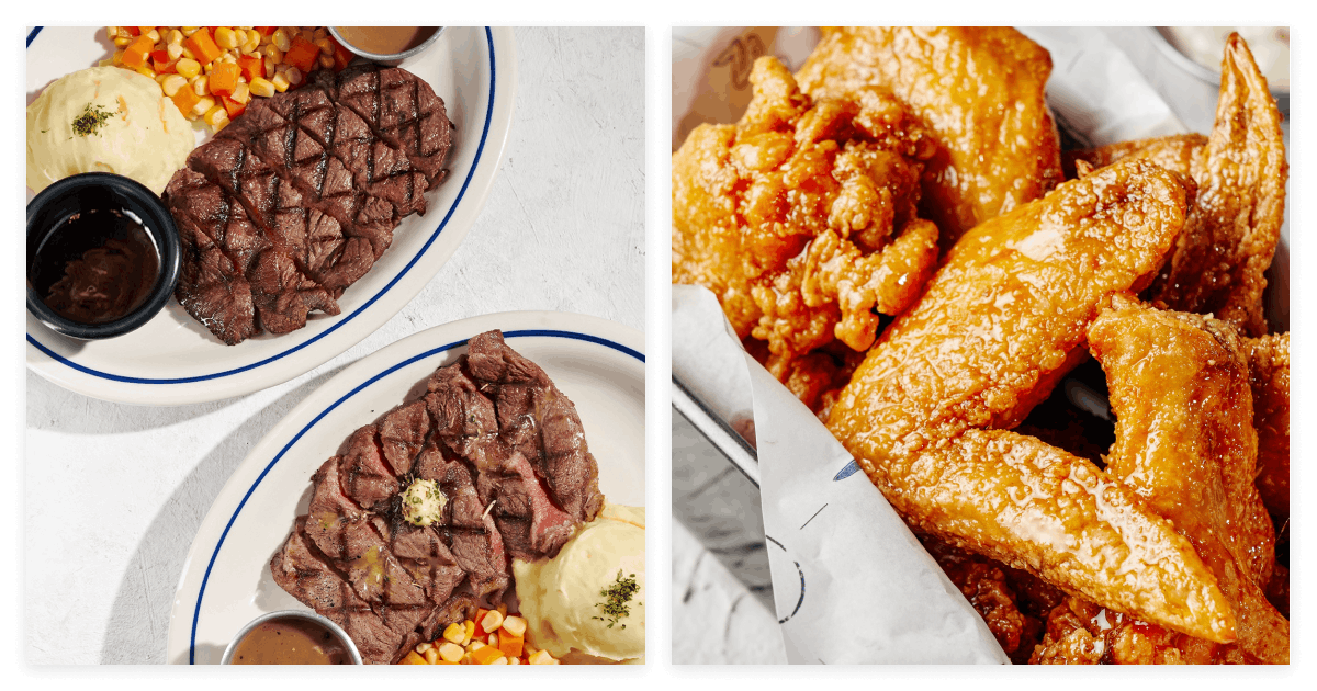 USDA Flat Iron Steaks and chicken wings—no overthinking, just really good food.