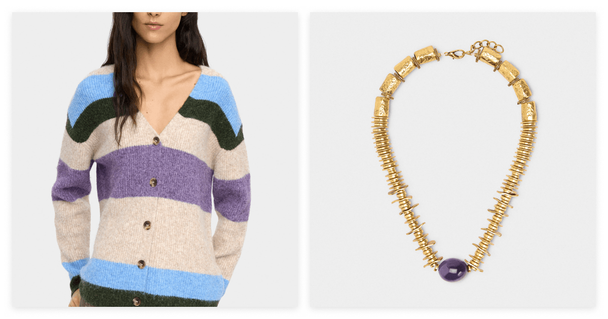 Layer it with the striped knit cardigan from Parfois for texture and warmth. Add the short stone pendant necklace to elevate the look just enough—and it has both gold and violet colors in it too! This outfit is ideal for low-key celebrations, café hopping, or chilling after checking out what’s new at an SM Mall near you.