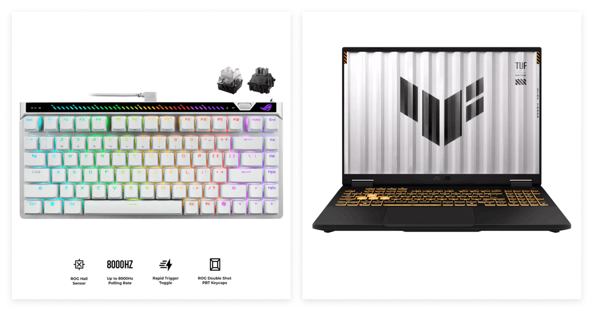 L-R: ASUS ROG Falchion Ace 75% in White and the ASUS TUF Gaming F16 laptop, both available at DataBlitz