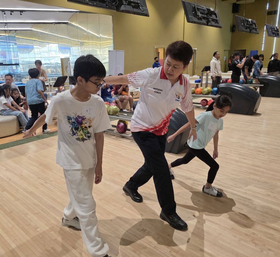 A Philippine national coach demonstrates proper bowling technique, guiding a young participant.