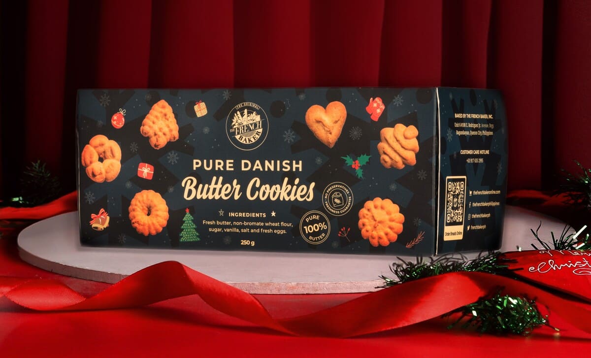 Pure Danish Butter Cookies in a Jar. This is a French Baker classic that customers keep coming back for every Christmas. The butter cookies come in a big glass jar, sealed with plastic to keep air out and prolong shelf life, and packaged in a beautiful carry box that keeps the cookies snugly in place. Long after the holidays are gone, the glass jar should make a lovely and functional décor in the kitchen. This year, The French Baker has also made these golden butter cookies available in a small but elegant box that represents the brand’s new and more festive packaging design. The package design captures the elegance of French artistry, featuring intricate patterns that evoke holiday joy and bring a touch of sophistication to your celebrations this yuletide season.