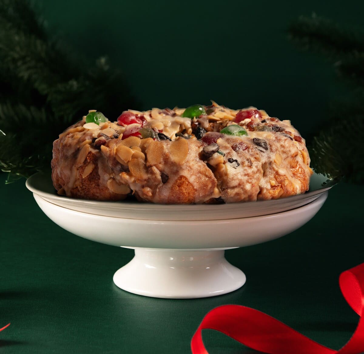 Brioche Bordelaise. This Bundt cake makes a comeback this festive season. Enjoyed by many over the past few Christmases, it looks as stunning as it tastes, with dripping royal frosting studded with candied cherries and glazed fruits on top.