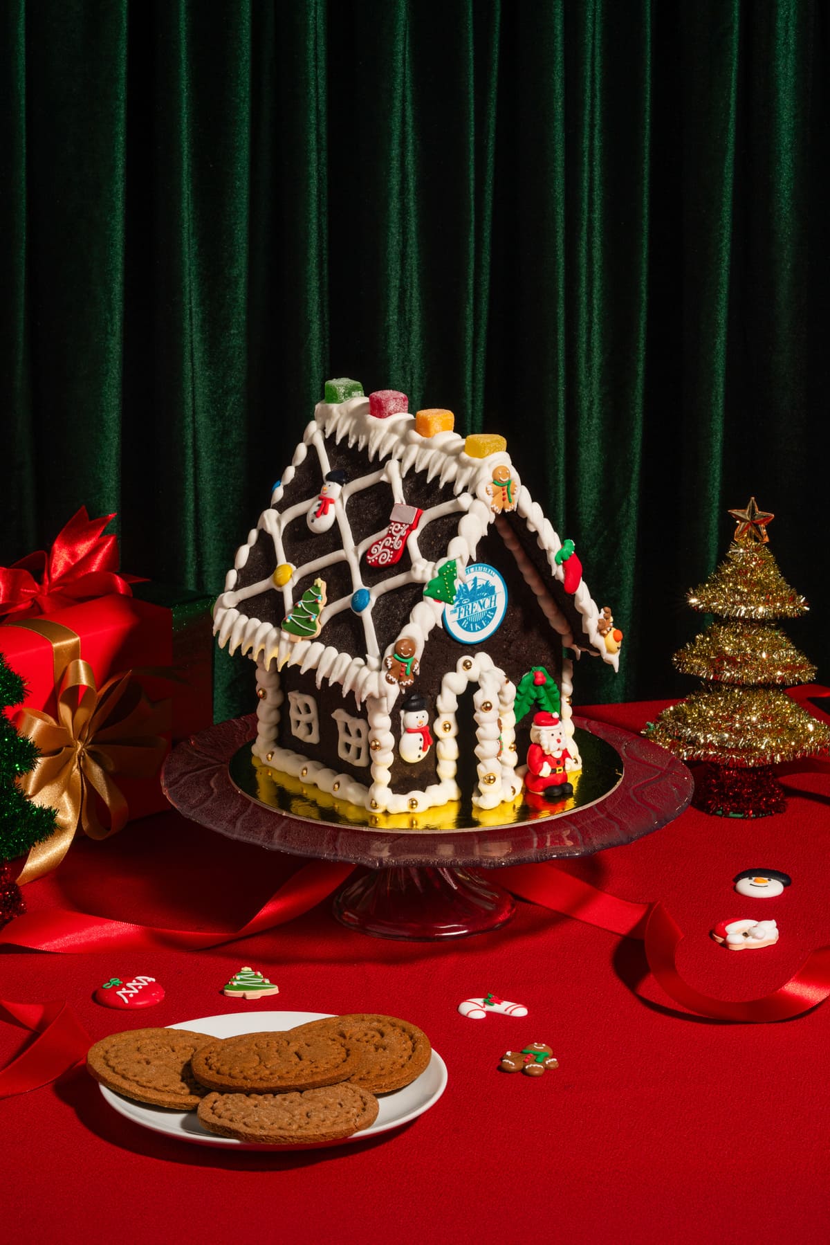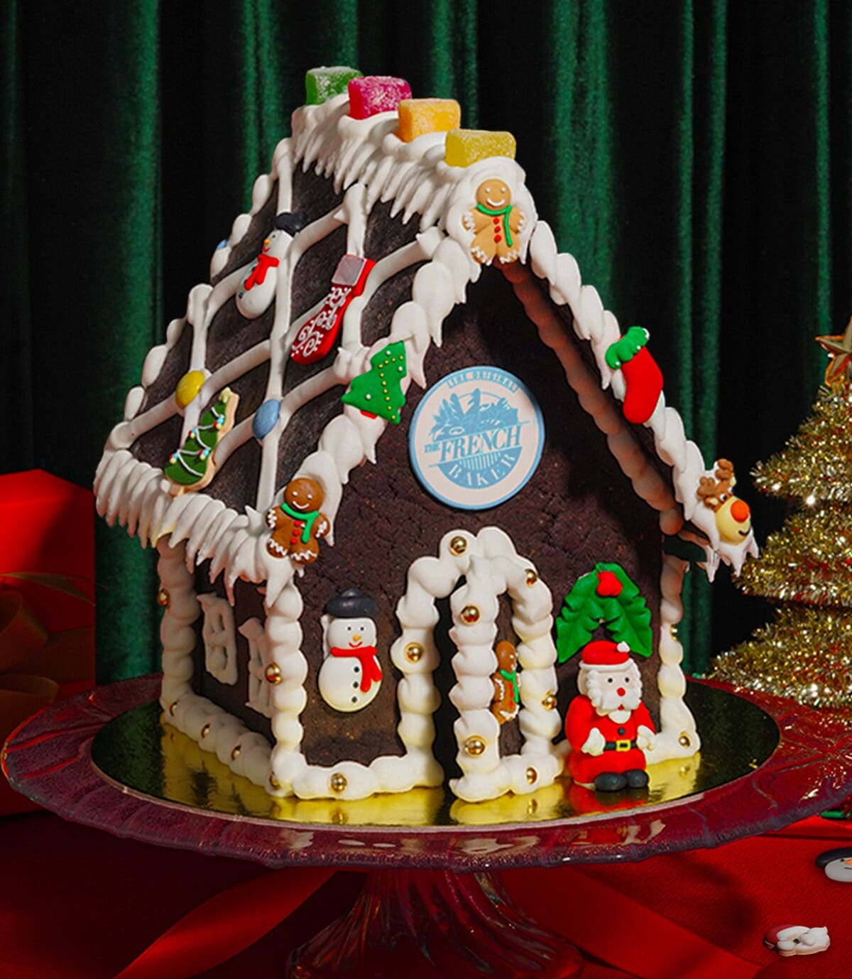 Gingerbread House. An evocative piece of pastry that captures an image of wintry Christmas in the West, this Gingerbread House is made of gingerbread cookie walls and roofs, frosted with royal icing to resemble snow, and decked with bright and colorful candies, with a Santa figure standing cheerfully by the door.