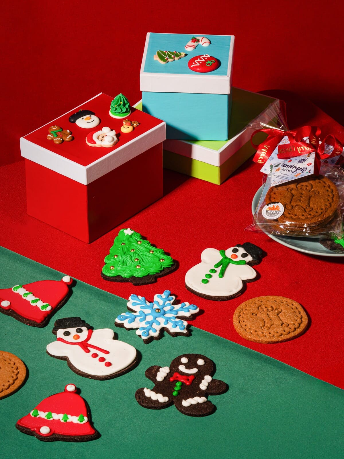 Christmas Cookies. Shaped and molded cookies, colorfully iced and decorated into four designs: Snowman, Christmas Tree, Gingerbread Boy, and Christmas Bell figures, available per piece.