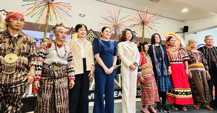 In the photo are: Department of Trade and Industry (DTI)-Bureau of Market Development, Promotions, and One Town, One Product (OTOP) Philippines Director Marievic Bonoan, Secretary Cristina Roque, and Department of Tourism Secretary Christina Garcia Frasco, with indigenous peoples at the launch of the National Arts and Crafts Fair 2024 at the SM Megamall Megatrade Hall.