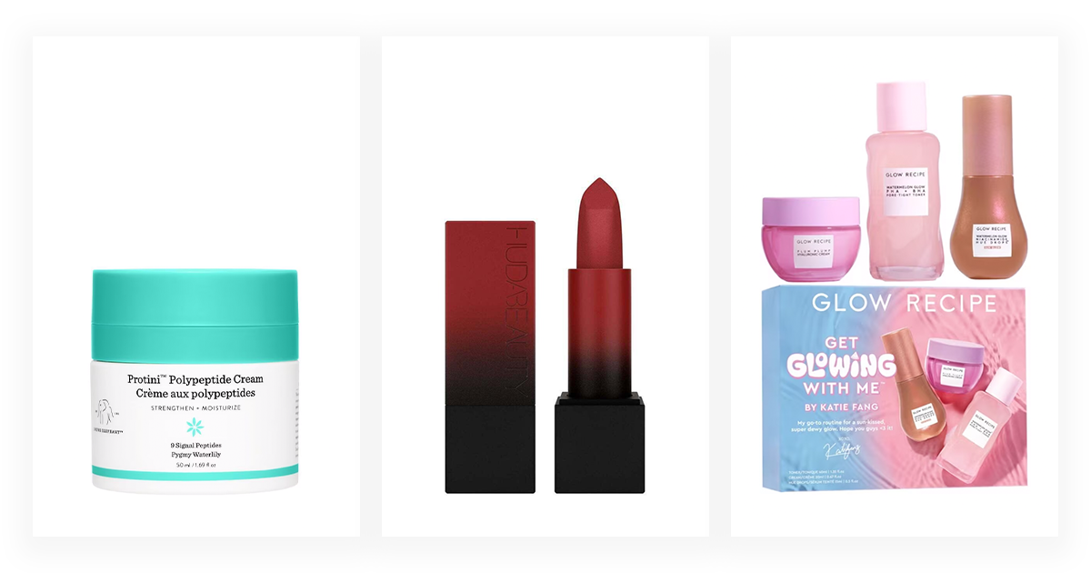L-R: Drunk Elephant’s Protini Polypeptide Cream, Huda Beauty Power Bullet Lipstick, Glow Recipe’s Get Glowing with Me set; photos from LOOK AT ME website.