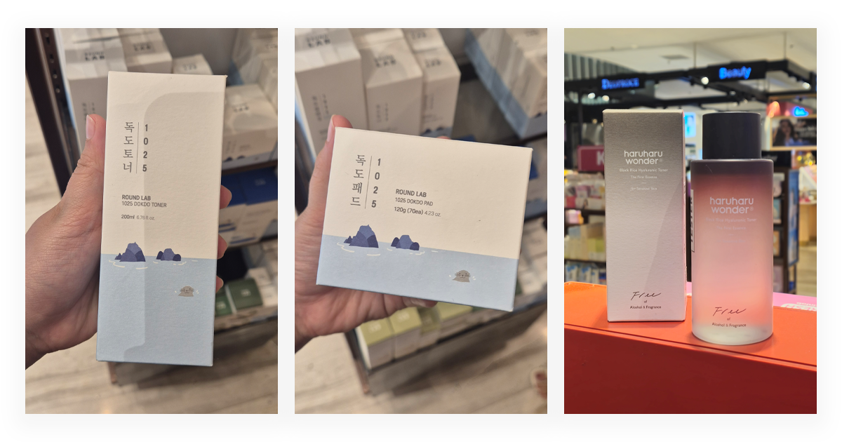 L-R: ROUND LAB 1025 Dokdo Toner and Pad; Haru Haru Wonder Black Rice Hyaluronic Toner