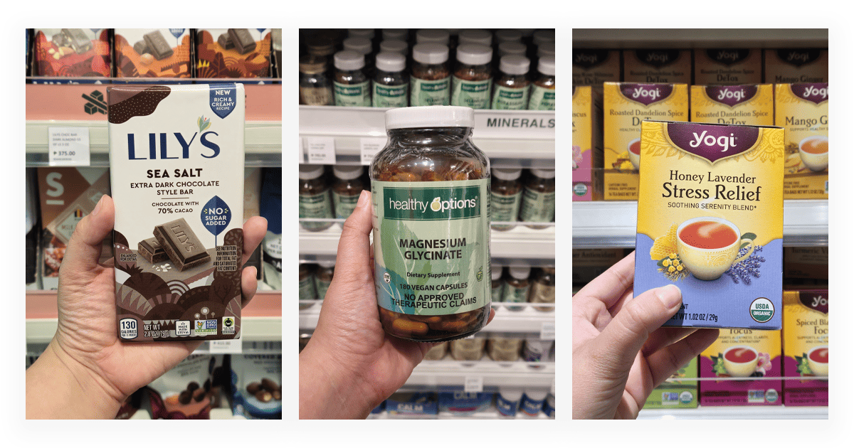 L-R: Lily’s Sea Salt Extra Dark Chocolate Style Bar, Healthy Options’ Magnesium Glycinate, and Yogi Honey Lavender Stress Relief Tea