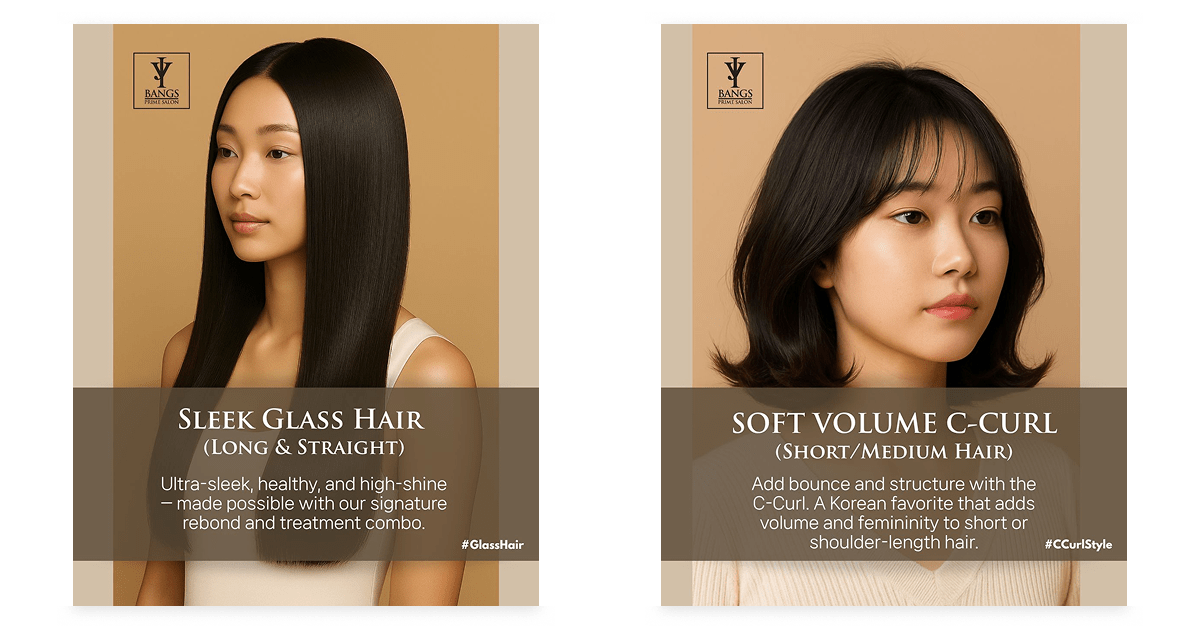 Bangs Prime Salon by Tony & Jackey specializes in Korean-inspired hairstyling, offering authentic techniques and premium haircare products tailored for Asian hair. They are known for their Precision Korean-style hair cut and blow-dry, as well as advanced hair color services that will have you looking like the K-Drama star of your dreams! Their Sleek Glass Hair service, lets you enjoy ultra sleek and healthy looking hair through their signature rebond and treatment combo. For those who want more bounce and structure to their locks, their Soft Volume C-Curl is a must-try! With crisp service, minimalist interiors, and trained Korean stylists, Bangs delivers salon-grade transformations, making it a go-to for stylish, K-inspired hair upgrades.