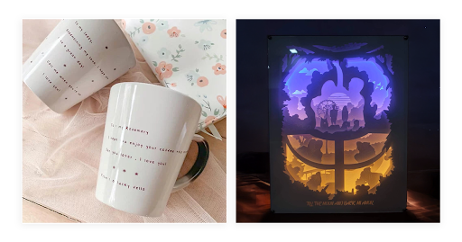 The Secret Message Mug (left) and Shadow Box (right) gifts from Ben and Bart surely take meaningful gifts to another level.