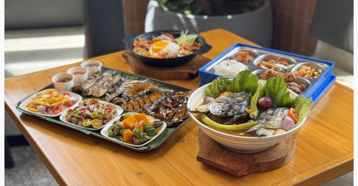 A spread of diverse dishes, including grilled seafood and fresh fish soup from Kain, and a Korean bento box from Seoul Good awaits diners.