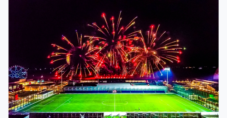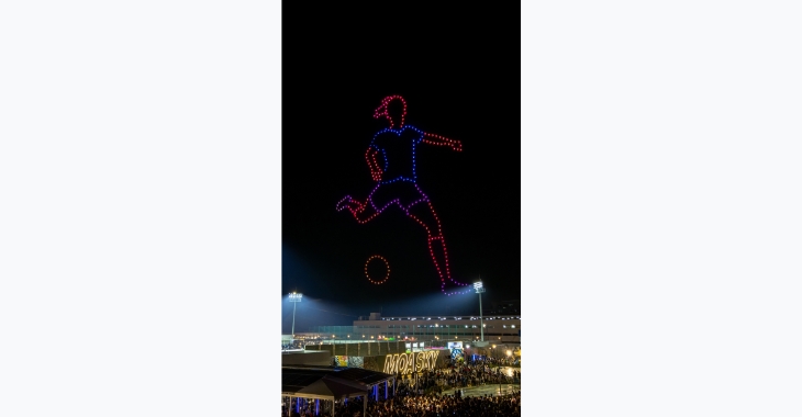 A drone display enhances the excitement of the Filipinas’, the Philippines' women's national football team, exhibition game at the MOA Football Pitch.