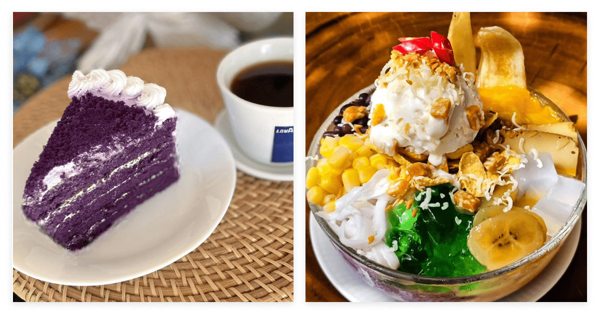 Photos of Ubeng Ube cake (left) and Halo-Halo Supreme (right) from Rafabel’s and Adriana’s on Facebook