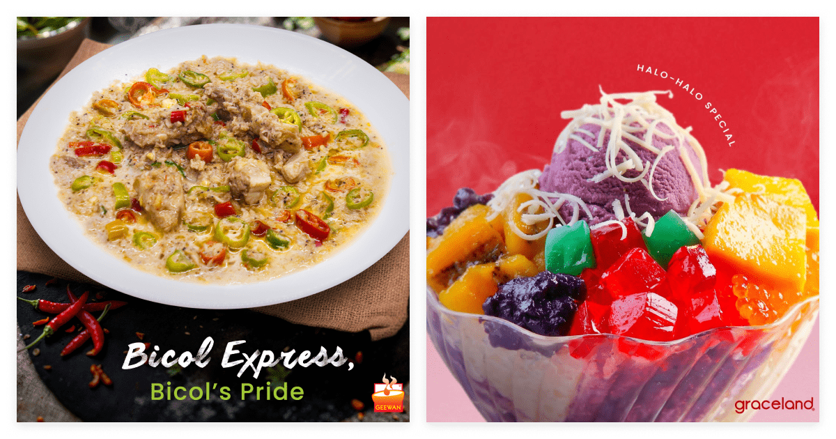 Photos of Bicol Express (left) and Halo Halo Special (right) from Geewan Restaurant and Graceland on Facebook