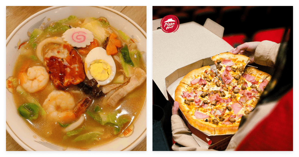 Photos of Gomoku Ramen (left) and the classic meatlovers pizza (right) from Rairaiken and Pizza Hut on Facebook