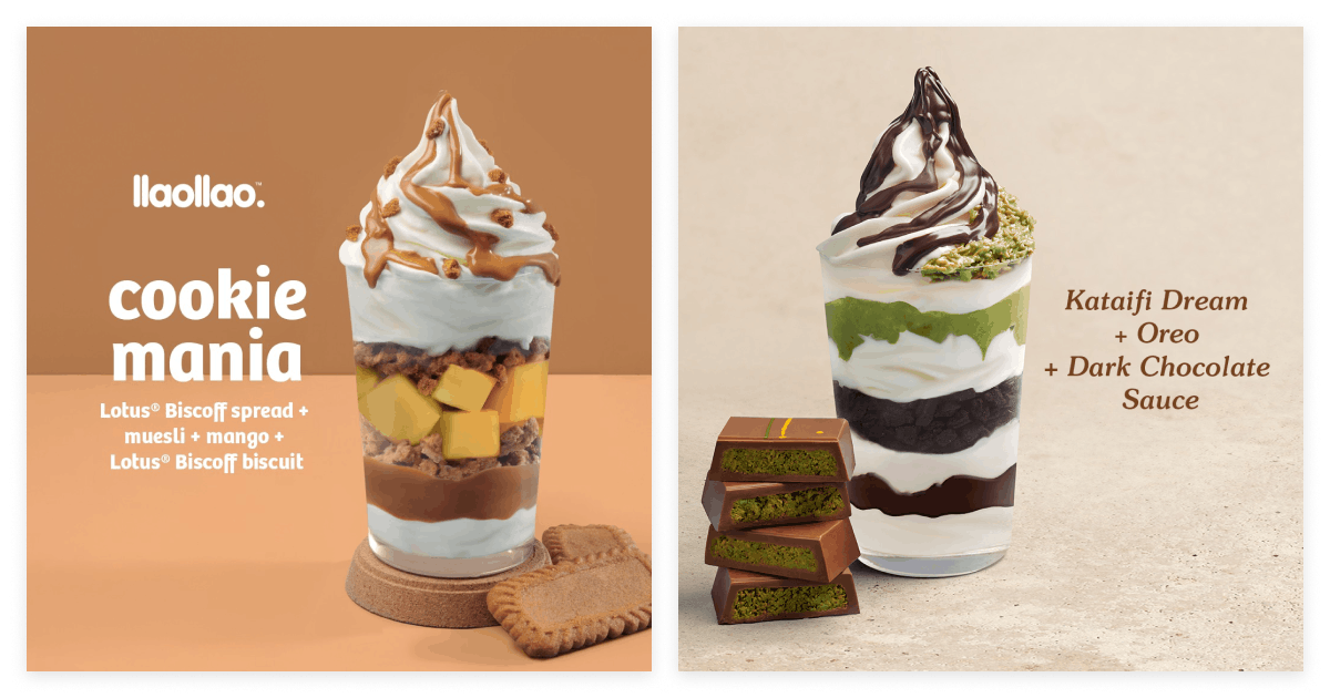 Go for the Lotus Biscoff build: spiced cookie sauce, actual Biscoff crumbles, and fresh fruit for crunch and contrast. Or go all the way with dark chocolate-hazelnut sauce, Oreo crumbs, and chocolate chips. Every bite has texture, flavor, and a little bit of chaos. Good chaos.