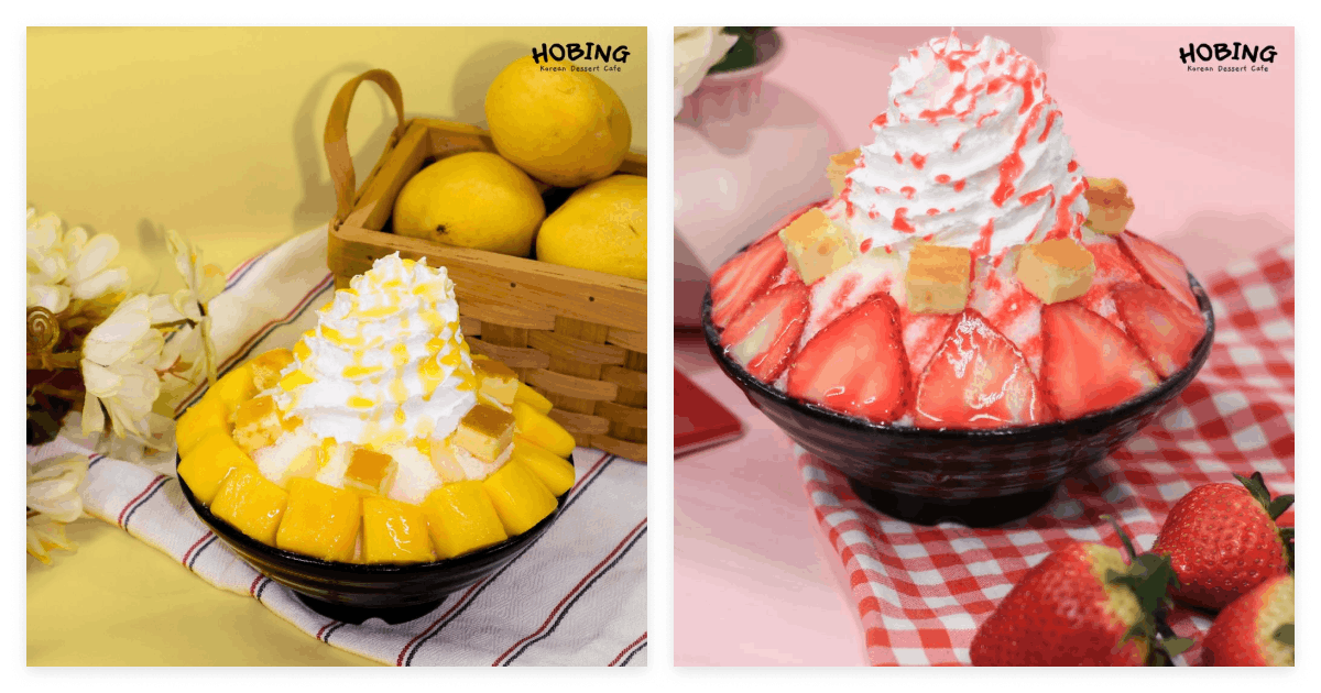 If you're in your bingsu era, Mango Cheese Bingsu is the one people can't stop talking about. Think ripe mango sweetness balanced against a slightly salty cream cheese drizzle, sitting on shaved ice that melts on your tongue, not in your hands. The Strawberry Cheese version gives the same energy but makes it pink and a little more tart. And Injeolmi (toasted soybean powder, chewy rice cake bits, red bean) is earthy, subtly sweet, and the kind of flavor you're still thinking about three days later. Find these at Hobing.