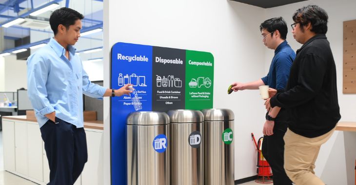 SM employees lead by example as they properly segregate waste using the RDC (Recyclable, Disposable, Compostable) bin system—showing that building a #SMWasteFreeFuture starts from within.