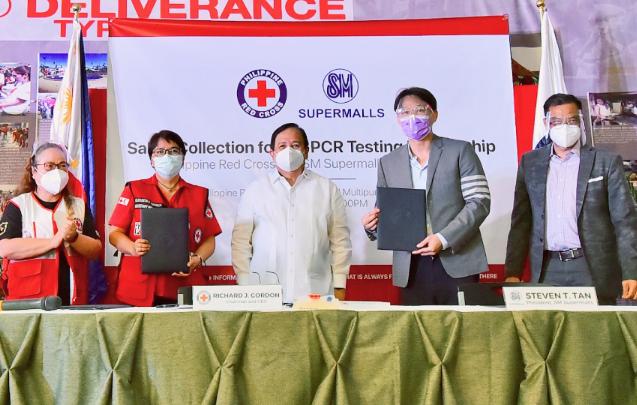 In photo: Philippine Red Cross (PRC) Head of Molecular Laboratories and Former DOH Secretary Dr. Paulyn Jean Ubial, PRC Secretary General Elizabeth Zavalla, PRC Chairman and CEO Sen. Richard Gordon, SM Supermalls President Steven Tan, and SM Supermalls SVP for Operations Bien Mateo during ceremonial MOA signing, held at the PRC Logistics and Multipurpose Center in Mandaluyong City.
