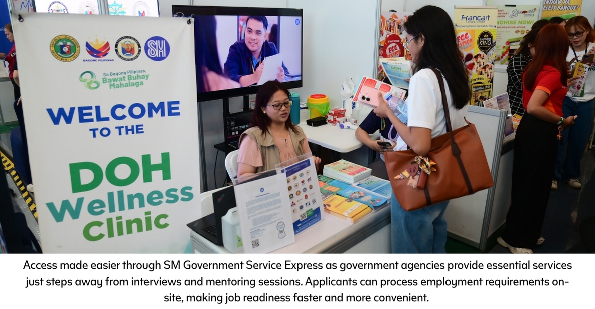 To further streamline the journey from application to employment, SM Government Service Express enabled participants to process key requirements on-site. Participating agencies included the National Bureau of Investigation, Social Security System, Bureau of Internal Revenue, Philippine Health Insurance Corp., and the Pag-IBIG Fund—making essential services more accessible in one convenient location.