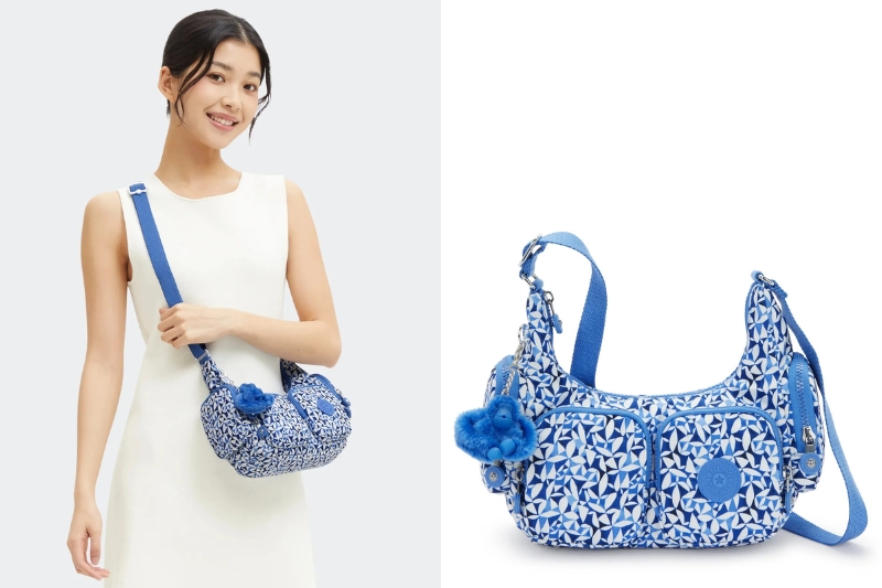 It features a whimsical blue and white floral-inspired pattern, complemented by a matching blue adjustable shoulder strap and the brand’s iconic furry monkey keychain. Although compact in size, it has generous features, including inside, front, back, and side pockets to keep all your knick-knacks secure and organized.